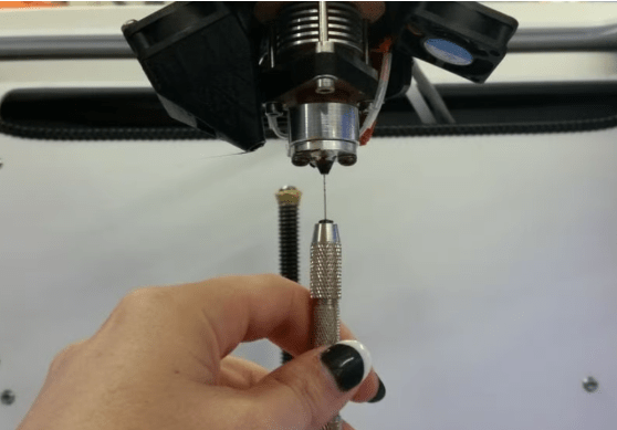 - Gently insert the needle, move in and out, and purge filament with extrusion commands.